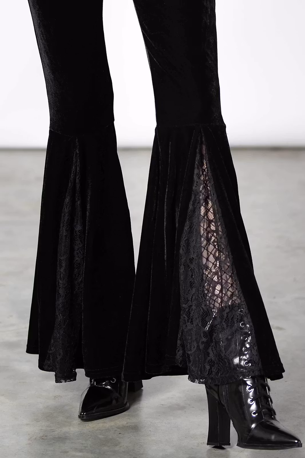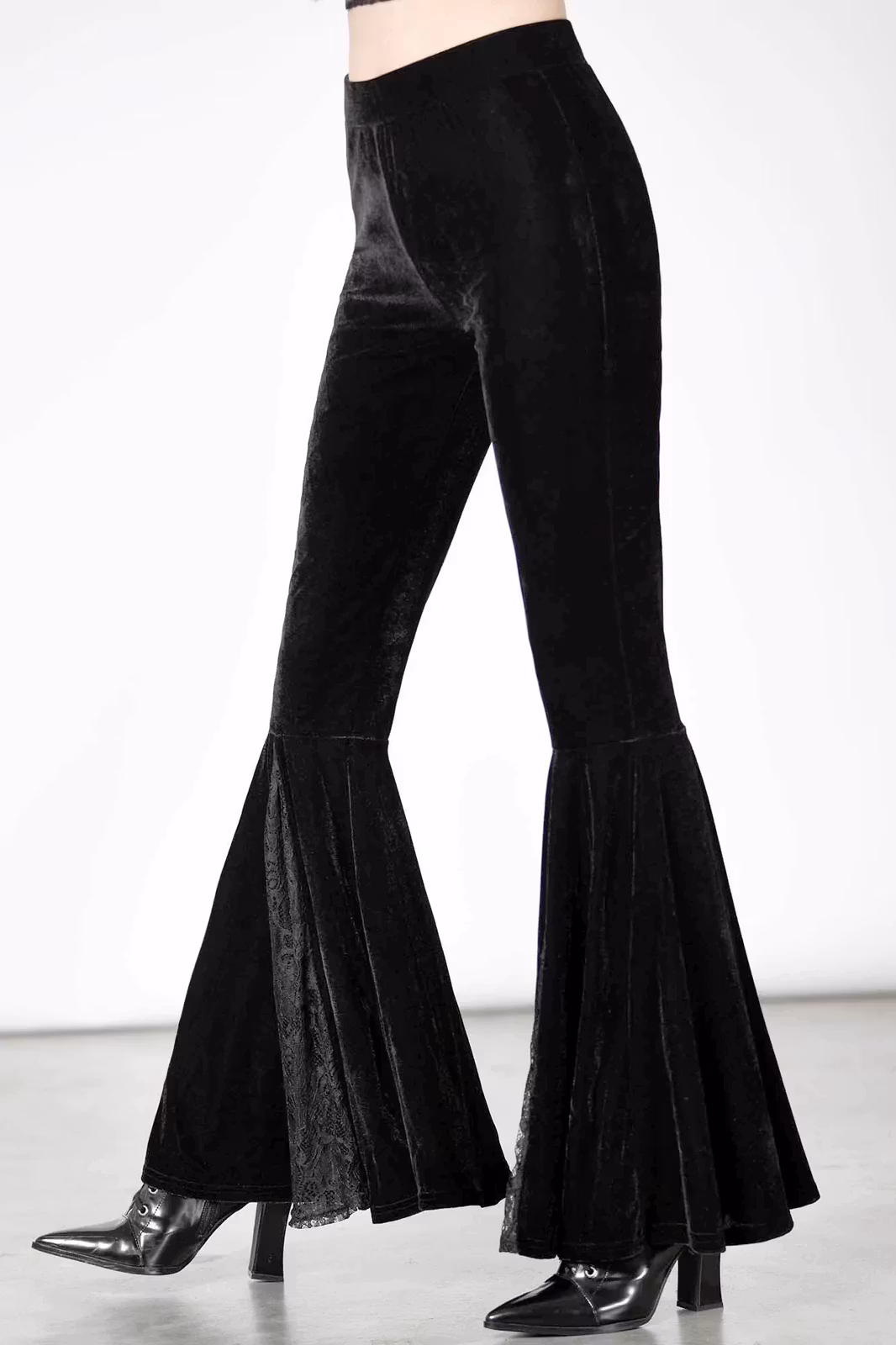 Superfina långa utsvängda byxor i lite tjockare sammet från Killstar. Byxorna har ett fint parti av spets framtill i den utsvängda delen.