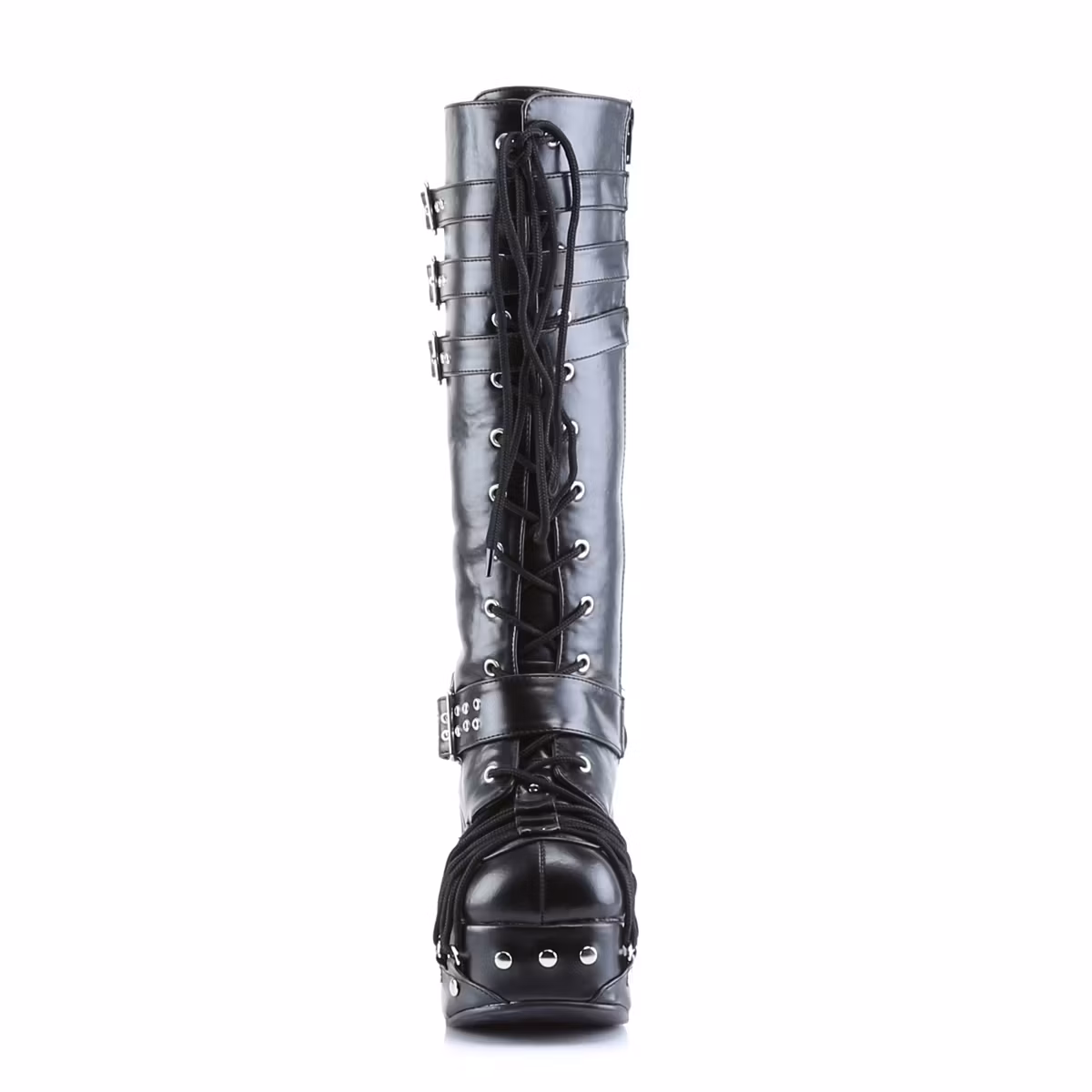 Charade-206 är supertuffa platåstövlar i skinnimitation med många tuffa detaljer från DemoniaCult. De har en klackhöjd på 11,4 cm och en platå på 5,1 cm och de stängs med både snörning fram och dragkedja i sidan. Det är amerikanska damstorlekar där 6 motsvarar 36, 7 37, 8 38, 9 39, 10 40, 11 41 och 12 42.