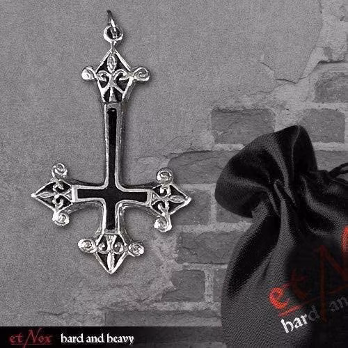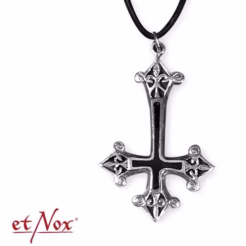 Fint inverterat kors i rostfritt stål från etNox. Det upp och nervända korset har svarta partier och ornamentdetaljer. En tygrem på ca 80 cm medföljer.